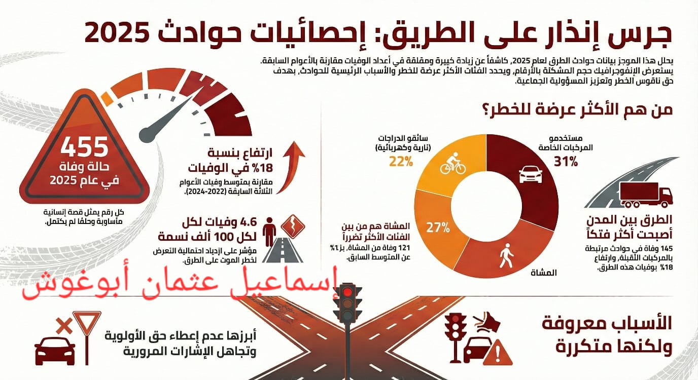 لم يعودوا مجرد أرقام تُذكر في تقارير رسمية أو تمرّ عابرة في نشرات الأخبار، بل هم 455 قصة إنسانية توقفت حياتها فجأة على الطرقات. خلف كل رقم أسرة مكلومة، وحلم انطفأ، ومستقبل لم يكتمل.